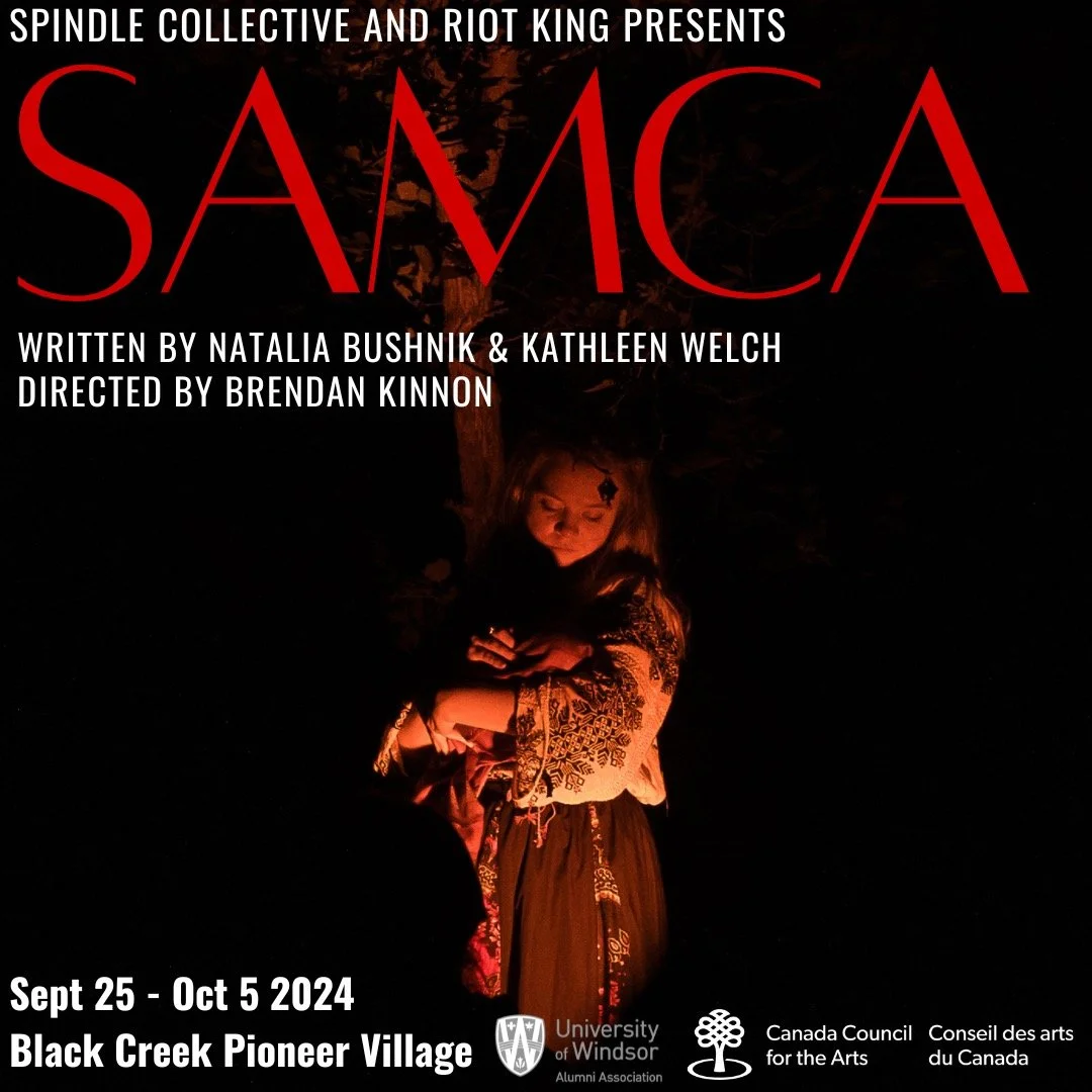 SAMCA has been in development since 2021. In that time, SAMCA was a Top Ten Finalist in the 2021 Wildfire National Playwriting Competition, won First Place at the 2022 Hamilton Fringe New Play Contest, has received funding from the Ontario Arts Council as recommended by Nightswimming in 2022, Why Not Theatre in 2023 and from the Toronto Arts Council Project Fund in 2023. In July of 2023, a scaled down version of SAMCA was presented to sold-out audiences at the ‘In the Soil’ Festival as a special site-specific/roaming presentation in Burgoyne Woods.
